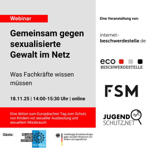 Anlässlich des Europäischen Tags zum Schutz von Kindern vor sexueller Ausbeutung und sexuellem Missbrauch am 18. November 2025 informieren die Beschwerdestellen eco, FSM und jugendschutz.net über Meldemöglichkeiten und Präventionsmaßnahmen in einer gemeinsamen Online-Veranstaltung:
